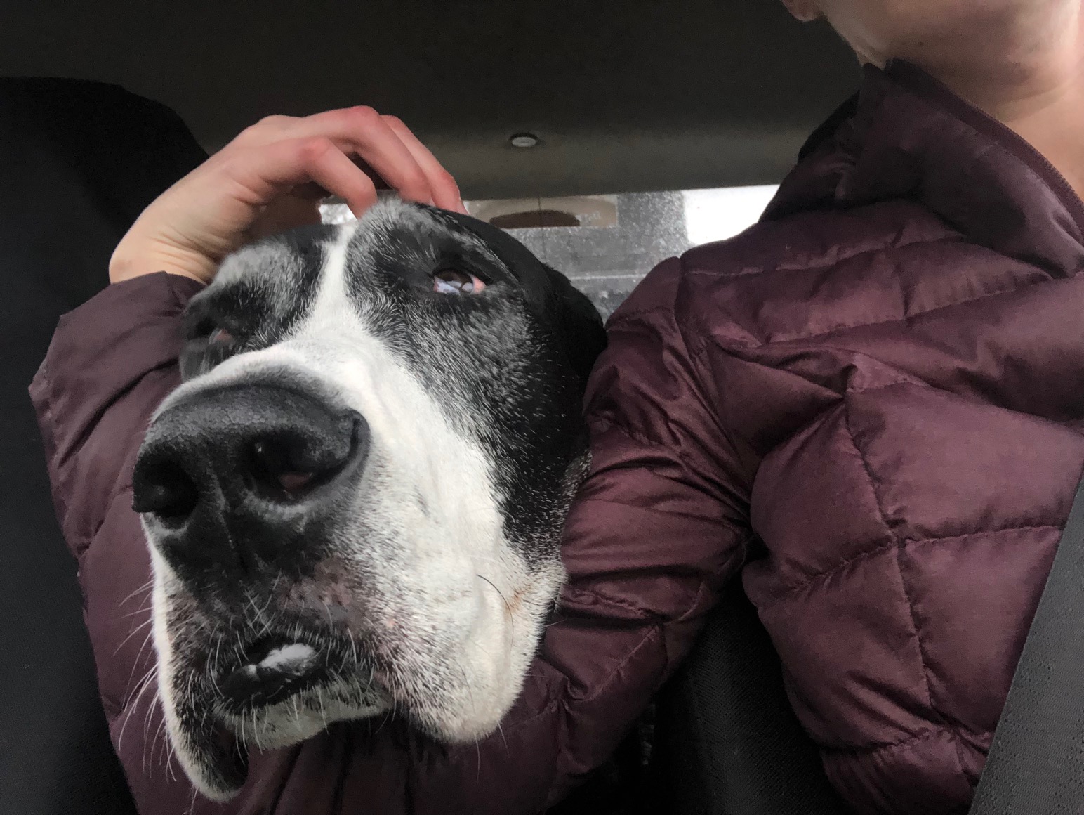 It’s the last appointment of the day at Armory Animal Hospital. We are taken to a peaceful room where Maggie eventually lays on her right side with her head in Cory’s lap and my head laying over her heart with my arms around her chest and belly. She’s already been given a sedation injection to help calm her nerves. Dr. Corey inserts the needle and I start crying. Cory starts crying. We are assured it will be a peaceful transition. I feel her chest rise and fall, rise and fall, and then… fall. I hold her till her last breath and after. With my head still on her no-longer-beating heart I bawl and Dr. Corey whispers, “she’s gone.” It is the saddest moment of my life.